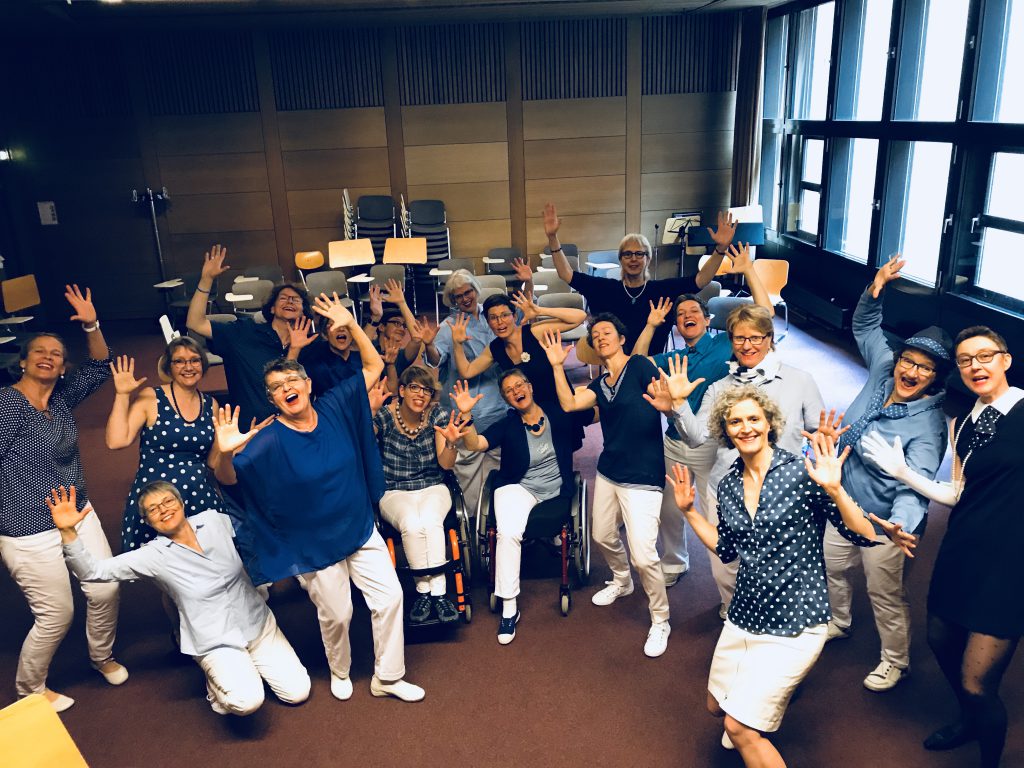 Neben bekannten Popsongs, Chansons und Volksliedern graben wir auch gerne unbekannteres Liedgut aus und geben ihm mit einem eigenen Arrangement einen neuen Anstrich. Hartnäckig treffen wir uns jeden zweiten Dienstag zur Probe, wo es stets konzentriert, aber mit Schalk zur Sache geht. Immer gerne erinnern wir uns an kleine Pannen, etwa die, als eine Sängerin während des Stücks Raindrops den Schirm partout nicht öffnen konnte und mit ihren vergeblichen Versuchen dem Stück eine eigene Choreographie verlieh. Oder die Episode, als die Dirigentin während des Konzertes die Stimmgabel im Décolleté versenkte.